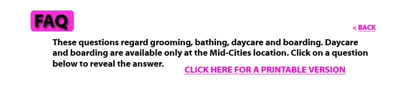 Do I need an appointment for bath and groom pets? Yes, our locations have block scheduling for groom pets and bath pets must be in before two. Staggering the dogs throughout the day allows us to minimize the amount of time a dog spends up here generally no more than 3-4 hours. You are welcome to drop your pet off before your time and have until close to pick the animal up once we call. Walk-ins will be accepted if our schedule allows, but can never be guaranteed. Do you keep the pet all day? Not necessarily. Our block scheduling generally only requires a pet to stay up here several hours at a time. If your pet requires special attention, such as sedation or Express Service, we will be more than happy to accommodate with a small processing fee. Facilities with daycare also welcome socialized, altered, fully vaccinated pets to open play at no charge before they are groomed. Do you require vaccinations? Yes. Bath and groom pets require proof of rabies. In order to play with the other dogs in daycare or boarding; we need proof of rabies, parvo, distemper and bordetella. Do you machine wash the pets? No, every pet is washed carefully by hand. Can I bring a picture of how I wish my dog to look? Absolutely! Feel free to email or bring a picture of previous grooms or the look you are going for. Sometimes a picture conveys your desires more than words ever could. We can even save the picture in our database to reference for future appointments. Can someone other than me drop off my pet? Yes, but if they are unsure of how you would like the pet's hair cut please leave instructions with us when making the appointment to maximize your satisfaction. Can I bathe my own groom pet at a discount? We advise against it. Our professional tools, greater water pressure, experience and other variables allow us to make sure that your dog's coat is in the best condition possible before going on the grooming table. Will you de-matt the dog? We will de-matt pets for an additional fee (including clipper blade wear/tear) at an extra charge. Do you sedate the pets? We do not sedate pets without consent. There are times; however, for safety we may advise you acquire a sedative thru your vet and administer it before bringing the pet in. Sedated pet incur a rush fee because of the limited time frame to work with them. Do you have breed restrictions? No. House of Paws believes that responsible owners not phenotype dictate a dog's temperament. We happily accept human-friendly dogs of all size and breeds and well socialized dog are welcome in daycare (Stopbsl.org). Do you walk the dogs? Boarding and daycare dogs are walked on a set schedule. Bath and groom dogs that are here for an extended period of time or indicate they need to go will be walked as well. We still advise, however, that you walk your dog at drop off and pick up. What if I'm not completely satisfied with my pet's haircut? Please notify us within 72 hours and we'll do everything within our capacity to rectify the situation. What should I know before boarding my dog? Provided your dog is fixed (if six months or older) and gets along well with other dogs they get to play in the doggy daycare all day long. The play area is indoors and climate controlled, but they are walked several times a day. Boarding dogs are kenneled individually at night. We have blankets and bowls and prefer to use our own so they do not get mixed up. We advise you to bring your own food (suddenly changing a dog's diet can upset its digestion), but we do keep food on hand if you forget. Do you board cats? No. Our facility is not set up to board cats. Will my boarding dog receive a bath? All boarding dogs will receive a bath at 50% the normal price on the day of pick up. Large congregations of dogs often play in ways their owners would prefer they didn't (drooling on one another, urinating on one another) and we insist all dogs leaving our facility are sparkling clean. Do you give daycare tours? Yes, but not while we are actually in the process of grooming pets. Our facility's lay out requires you to walk thru the grooming area (risk of disturbing the pets on the table) and bathing area (risk of slippery floors). You are welcome to check out the daycare area at the beginning and end of the day. Will you help me find homes for my litter or stud out my dog? While House of Paws respects the hard work of responsible breeders, we generally advocate rescue and adoption. We are happy to network with shelters, rescues and foster homes to find homes for these pets. |